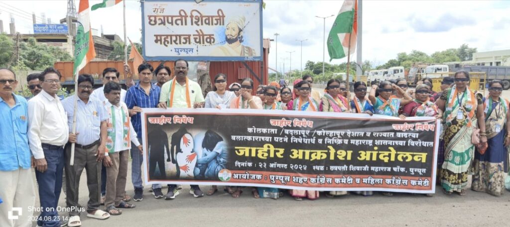 संपूर्ण महाराष्ट्रात गुन्हेगारांनी कळस गाठला आहे मुख्यमंत्री व गृहमंत्री पूर्णतः निष्क्रिय झाले असून ते केवळ परत राज्यात सत्ता प्राप्ती कशी करता येईल याकडेच लक्ष देत असल्याचा आरोप करीत महिला काँग्रेस तर्फे प्रदेश अध्यक्ष संध्याताई सव्वालाखे, खासदार प्रतिभाताई धानोरकर,जिल्हाध्यक्ष नम्रता ठेमस्कर शहर अध्यक्ष राजुरेड्डी यांच्या मार्गदर्शनाखाली व काँग्रेस महिला जिल्हा उपाध्यक्ष यास्मिन सैय्यद व महिला जिल्हा महासचिव पदमा त्रिवेणी यांच्या नेतृत्वाखाली आज दिनांक 23 ऑगस्ट रोजी शिवछत्रपती शिवाजी महाराज चौक येथे डोळ्यावर काळ्या फिती बांधून व महाराष्ट्र शासन मुर्दाबादच्या घोषणा देत महिलांनी आपला संताप व्यक्त करीत आरोपीना भर चौकात फाशी द्या गृहमंत्री देवेद्र फडणवीस राजीनामा द्या अशी मागणी केली.