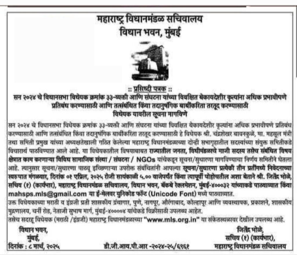 महाराष्ट्र शासन एक नवा कायदा आणू पहात आहे. तो अस्तित्वात आला तर कोणत्याही व्यक्ती किंवा संघटना यांना कोणत्याही विषयावर शासनाविरुद्ध बोलता येणार नाही. शासनाला अमर्यादित अधिकार देणाऱ्या या कायद्यावर हरकती सूचना देण्याची अंतिम तारीख १ एप्रिल २०२५ आहे. या कायद्याचे नाव